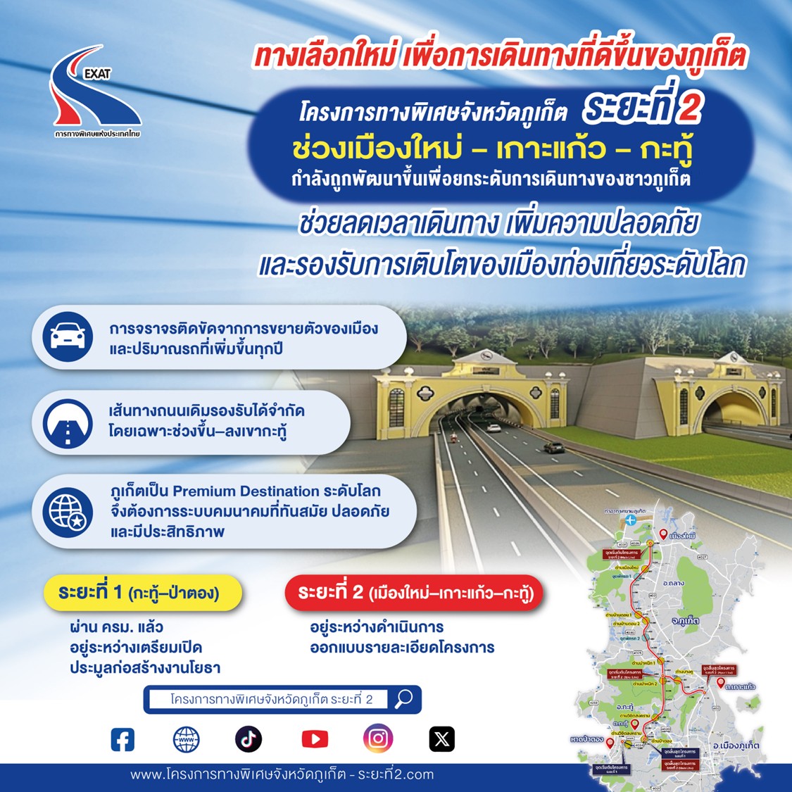ปัจจุบัน กทพ. ได้ว่าจ้างกิจการร่วมค้า Consortium ประกอบด้วยบริษัท โชติจินดา คอนซัลแตนท์ จำกัด บริษัท ยูทิลิตี้ ดีไซน์ คอนซัลแนท์ จำกัด บริษัท เอเชี่ยน เอ็นจิเนียริ่ง คอนซัลแต้นส์ จำกัด บริษัท เอพซิลอน จำกัด บริษัท เอ็มเอชพีเอ็ม จำกัด บริษัท วิสิทธิ์ เอ็นจิเนียริ่ง คอนซัลแนส์ จำกัด และบริษัท เอ็นทิค จำกัด เป็นผู้ให้บริการออกแบบรายละเอียดโครงการทางพิเศษจังหวัดภูเก็ต ระยะที่ 2 ช่วงเมืองใหม่ - เกาะแก้ว - กะทู้ โดยมีวัตถุประสงค์เพื่อออกแบบรายละเอียดโครงการ (Detailed Design) จัดทำเอกสารประกวดราคางานก่อสร้างโครงการ ระยะเวลา 300 วัน (วันที่ 3 พฤศจิกายน 2568 ถึงวันที่ 29 สิงหาคม 2569) และดำเนินงานร่วมกับ กทพ. ในการคัดเลือกและประเมินข้อเสนอของผู้รับจ้างงานก่อสร้างโครงการ ระยะเวลา 720 วัน